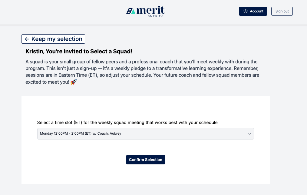 From the drop-down, choose the squad time slot that works best with your schedule. Remember to click "Confirm Selection" to finalize.