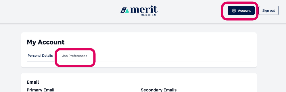 Navigate to the job preferences tab of your account page, either by going directly to https://my.meritamerica.org/learner_profile/me?tab=job-preferences or by clicking "Account" and then "Job Preferences" from anywhere in My Merit America