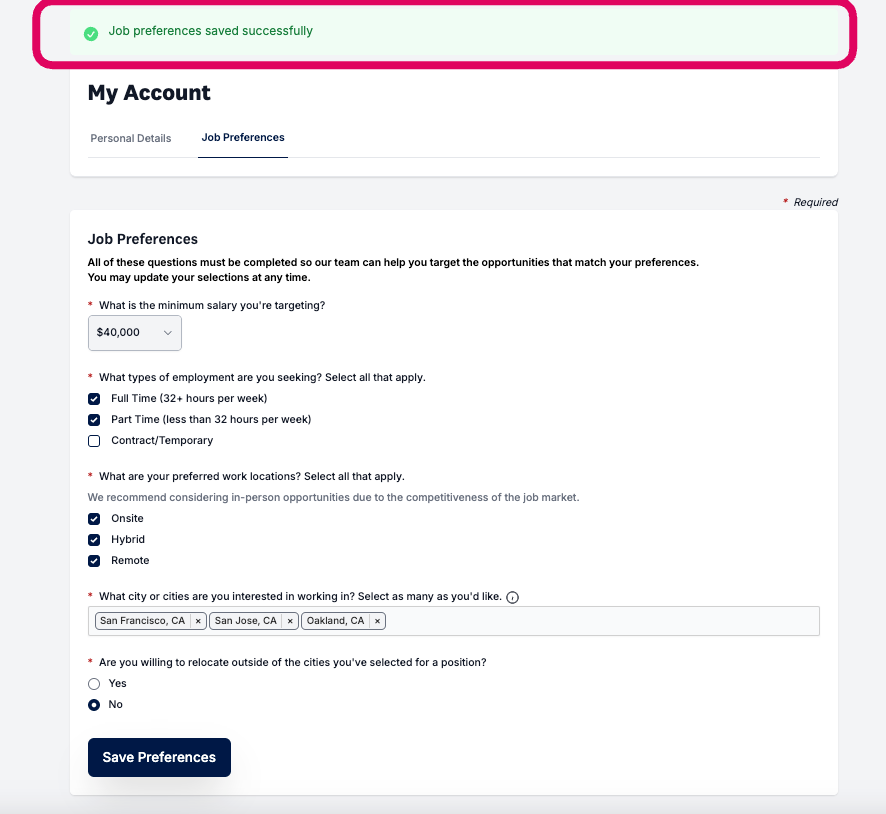 Once your preferences have been saved, you should see a green "Job preferences saved successfully" banner at the top