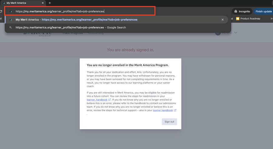 NOTE: Even if MMA says "You are no longer enrolled" when you log-in, you are still able to access your Job Preferences page. Simply paste the URL (https://my.meritamerica.org/learner_profile/me?tab=job-preferences) directly into your browser bar once signed in.