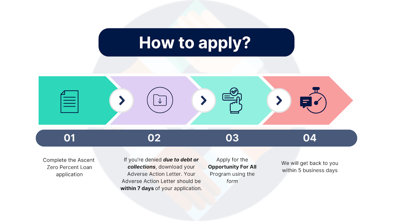 The Opportunity for All program is for Merit America learners who were denied the Zero Percent Loan from Ascent due to debt or collections and are unable to cover their costs through the currently available payment options, such as employer sponsorship or upfront payment.